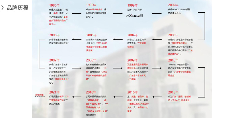 揭阳市兴财金属制品有限公司始创于1986年,是集研发、生产、销售各类不锈钢制品、五金制品的广东省龙头企业之一。 产品主要销往中国大陆,欧美、日本、韩国,东南亚等国家与地区。公司凭借精心的产品设计,严格的质量管理和热情细致的售后服务,在激烈的竞争中稳步前进,产品赢得了广大消费者的信赖和赞誉。